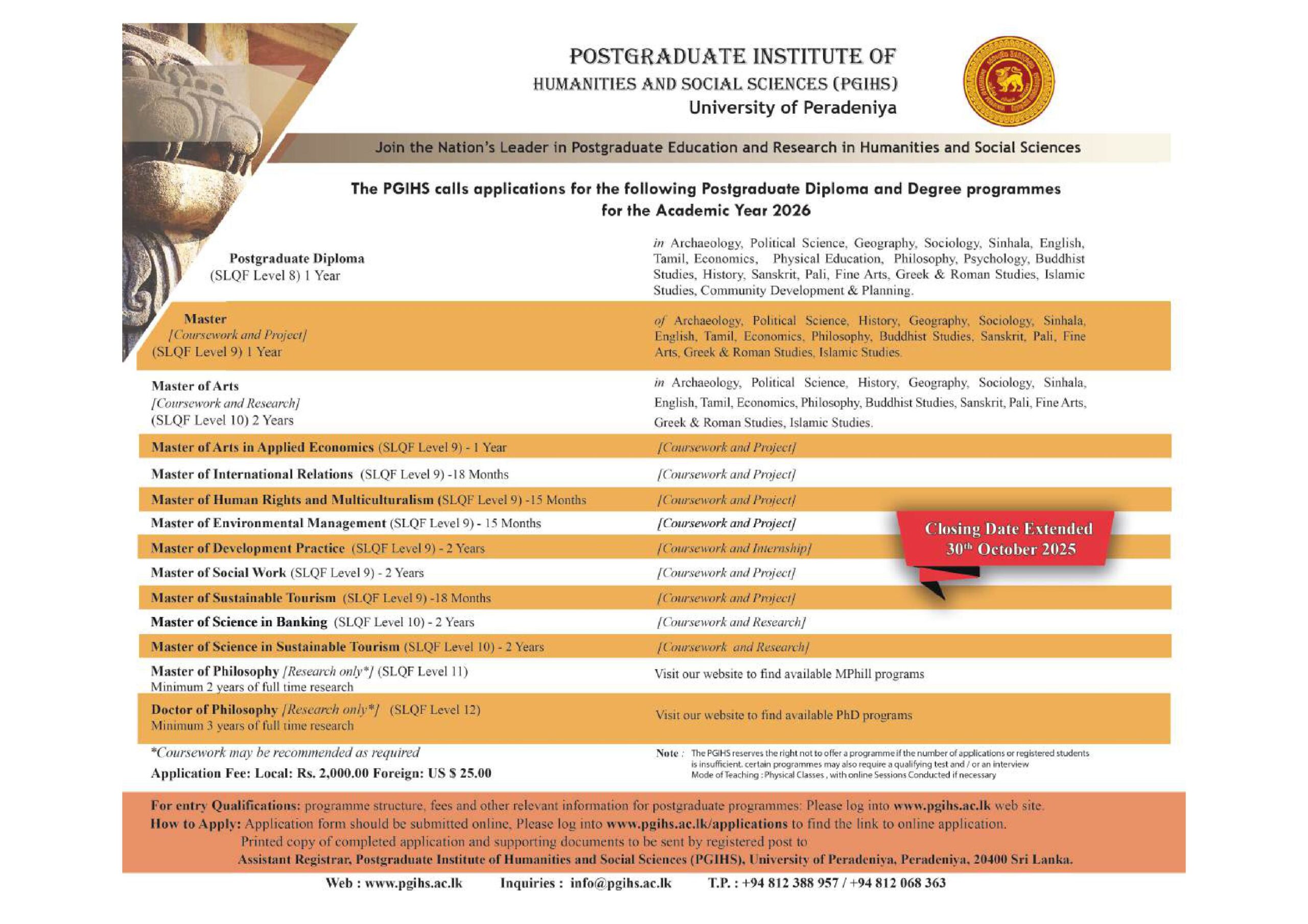 PGIHS – Call for Applications 2026 Intake The Postgraduate Institute of Humanities and Social Sciences (PGIHS), University of Peradeniya is now accepting...